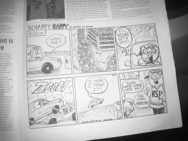 I started a comic strip called “Scrappy Happy“ for the weekly newspaper at KSU and got $10 per comic (24,000 copies were published every Tuesday). Getting the paper was the highlight of my week.